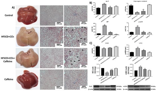 Effect of caffeine on the liver structure, liver damage, and oxidative stress markers in rats fed a high-fat, -sucrose, and -cholesterol diet plus CCl4 (HFSCD+CCl4 protocol or NASH model). (A) Macroscopic anatomy and microscopic liver structure. H&E staining of hepatic tissues from rats in the control, HFSCD+CCl4, HFSCD+CCl4+caffeine, and caffeine groups. Scale bar = 200 and 100 μm. Arrows show nuclei displaced toward the periphery of the cells. (B) Markers of liver damage. Serum alanine aminotransferase (ALT), gamma-glutamyl transpeptidase (γ-GTP), alkaline phosphatase (AP) activities, and hepatic glycogen content. Bars represent the mean of experiments performed in duplicate ± SEM (n = 8). (C) Oxidative stress markers. Degree of lipid peroxidation (LPO) and content of reduced glutathione (GSH). Bars represent the mean of experiments performed in duplicate ± SEM (n = 8). Western blot of 4-hydroxynonenal (4-HNE) and nuclear factor-E2-related factor 2 (Nrf2) proteins. Bars represent the mean of experiments performed in duplicate ± SEM (n = 3): β-actin was used as a loading control. (a) p < 0.05 compared with the control group; (b) p < 0.05 compared with the HFSCD+CCl4 group.
