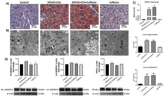 Moreover, the hepatic ultrastructure was disrupted in the HFSCD+CCl4 and HFSCD+CCl4+caffeine groups. The hepatic tissue contained abundant lipid droplets and disorganized mitochondria. Notably, transmission electron micrographs revealed that the hepatic parenchyma of the rats from the HFSCD+CCl4 group showed areas with collagen deposition, whereas that of the rats from the HFSCD+CCl4+caffeine group lacked collagen fibers (Figure 2B). The hepatic tissues of the rats from the caffeine group did not show significant changes in histology and ultrastructure, triglyceride content, or cholesterol content (Figure 2A). Western blot analysis revealed no significant differences in SREBP-1C and PPAR-α levels among the experimental groups (Figure 2D).