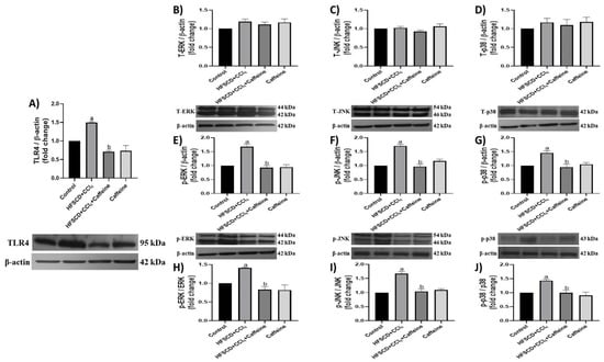 Effect of caffeine on the TLR4/MAPK pathway of hepatic tissue from the NASH model. Protein levels of TLR4 (A), ERK (B), JNK (C), p38 (D), p-ERK (E), p-JNK (F), and p-p38 (G) in the hepatic tissues from rats in the control, HFSCD+CCl4, HFSCD+CCl4+caffeine, and caffeine groups were determined using western blot analysis. Bars represent the mean of experiments performed in duplicate ± SEM (n = 3); β-actin was used as a loading control. p-ERK/ERK (H), p-JNK/JNK (I), and p-p38/p38 (J) ratios. Values are shown as a fold increment in optical density normalized to control group values (control = 1). Bars represent the mean of experiments performed in duplicate ± SEM. (a) p < 0.05 compared with the control group; (b) p < 0.05 compared with the HFSCD+CCl4 group.