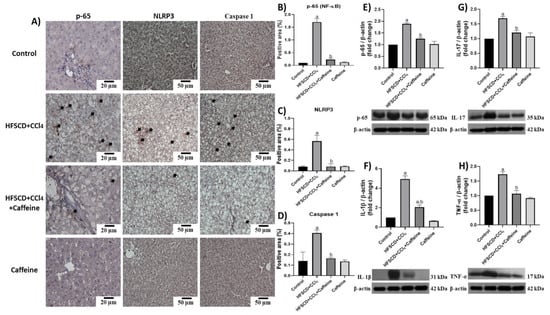 Effect of caffeine on NF-κB (p65) level, proinflammatory cytokines, and NLRP3 of hepatic tissue from the NASH model. (A) Representative IHC images of p65, NLRP3, and caspase 1 of hepatic tissues from rats in the control, HFSCD+CCl4, HFSCD+CCl4+caffeine, and caffeine groups. Scale bar = 50 μm and 20 μm. Percentage of positive area for p65 (B), NLRP3 (C), and caspase 1 (D) obtained from IHC slices (n = 4). Arrows indicate a positive label. Levels of p65 (E), interleukin (IL)-1β (F), IL-17 (G), and TNF-α (H). Proteins in hepatic tissues were detected using western blot analysis (n = 3). β-Actin was used as a loading control. Values are presented as fold increments in optical density normalized to control group values (control = 1). Bars represent the mean ± SEM. (a) p < 0.05 compared with the control group; (b) p < 0.05 compared with the HFSCD+CCl4 group.