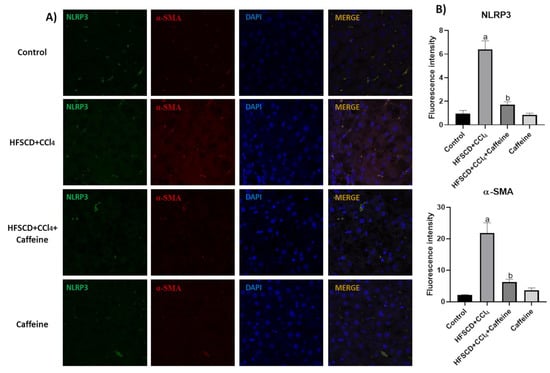 Effect of caffeine on NLRP3/α-SMA dual-labeling in hepatic tissue from the NASH model. (A) IF analysis of NLRP3/α-SMA in hepatic tissues from rats in the control, HFSCD+CCl4, HFSCD+CCl4+caffeine, and caffeine groups. (B) Quantification of fluorescence intensity of NLRP3 and α-SMA (n = 3). Bars represent the mean ± SEM. (a) p < 0.05 compared with the control group; (b) p < 0.05 compared with the HFSCD+CCl4 group. The slides were observed under a confocal microscope at 63× magnification.