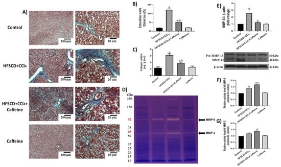 Moreover, ECM accumulation was evidenced via Masson’s trichrome staining and quantified by assessing liver hydroxyproline content (Figure 7A–C). ECM deposition was increased in the HFSCD+CCl4 group, but this accumulation was attenuated in the HFSCD+CCl4+caffeine group. No significant effects were observed in the caffeine control group. Scar tissue turnover was assessed by determining the activities of MMP-2 and MMP-9, and MMP-13 protein levels (Figure 7D–G). The activities of MMP-9 and MMP-2 were significantly higher in the hepatic tissues from the rats in the HFSCD+CCl4+caffeine group than in those from the rats in the HFSCD+CCl4 group (Figure 7F,G). By contrast, the protein level of MMP-13 was significantly increased in the hepatic tissues from the rats in the HFSCD+CCl4 group, and this alteration was prevented in the hepatic tissues from the rats in the HFSCD+CCl4+caffeine group (Figure 7E).