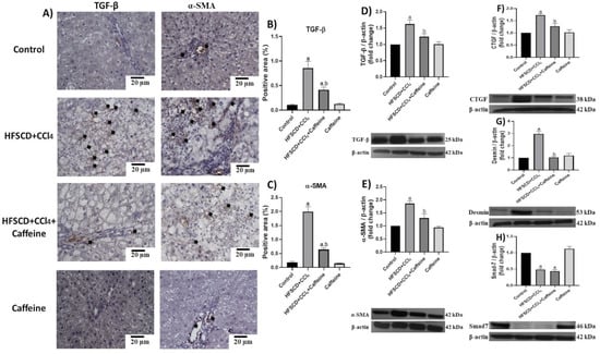 Caffeine maintains basal levels of TGF-β, α-SMA, and profibrogenic mediators in hepatic tissue from the NASH model. (A) Representative IHC images of TGF-β and α-SMA in the control, HFSCD+CCl4, HFSCD+CCl4+caffeine, and caffeine groups. Scale bar = 20 μm. Positive areas for TGF-β (B) and α-SMA (C) are shown in the histogram (n = 4). Protein levels of TGF-β (D), α-SMA (E), CTGF (F), desmin (G), and Smad7 (H) were detected using western blot analysis (n = 3); β-actin was used as a loading control. Values are shown as a fold increment in optical density normalized to control group values (control = 1). Bars represent the mean ± SEM. (a) p < 0.05 compared with the control group; (b) p < 0.05 compared with the HFSCD+CCl4 group.