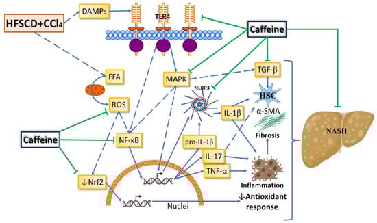NASH is a common liver disease worldwide without effective pharmacological treatment. It is a chronic and progressive liver disease that, in addition to steatosis, induces an inflammatory process that can promote fibrosis, cirrhosis, and hepatocellular carcinoma [,]. The NLRP3 inflammasome plays a pivotal role in NASH progression [], making it an attractive target for the treatment of NASH. Caffeine has been shown to protect the liver from acute and chronic damage of diverse etiologies through antioxidant, anti-inflammatory, antifibrotic, and antisteatotic mechanisms [,,]. However, the role of caffeine in the NLRP3 inflammasome signaling pathway had not yet been investigated. In the present study, we report for the first time that caffeine mitigates experimental NASH by inhibiting NLRP3 inflammasome activation and decreasing the TLR4/MAPK/NF-κB pathway. We also provide evidence that caffeine prevents oxidative stress, inflammation, and fibrogenesis by improving the Nrf2 signaling pathway and decreasing HSC activation in NASH (Figure 9).