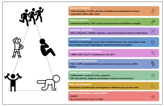 Benefits of exercise on nine cellular and molecular markers of aging (adapted from Rebelo-Marques et al. [7] and Garatachea et al. [8]). Abbreviations: AMPK, 5′adenosine monophosphate activated protein kinase; AUF1, AU binding factor 1; DNA, deoxyribonucleic acid; GH, growth hormone; GLUT4, glucose transporter type 4; IGF-1, insulin-like growth factor; IL-1β, interleukin 1β; IL-4, interleukin 4; IL-6, interleukin 6; IL-10, interleukin 10; IL-13, interleukin 13; mtDNA, mitochondrial DNA; NK, natural killer; NLRP3, NLR family pyrin containing 3; PGC-1α, peroxisome proliferator-activated receptor gamma-coupled receptor-1 alpha; SIRT, sirtuins; TERT, human telomerase reverse transcriptase.