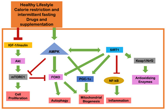 Molecular interactions that underlie the benefits of lifestyle, calorie restriction, intermittent fasting, drugs and supplements in geroprotection (adapted from Russo et al. [12]). The red bars in the figure indicate the inhibitory capacity of the molecular elements, while the green arrows refer to the capacity for stimulatory action. Abbreviations: Akt, protein kinase B; AMPK, 5′adenosine monophosphate-activated protein kinase; FOXO, forkhead box O; IGF-1, insulin-like growth factor 1; Keap1/Nrf2, Kelch-like ECH-associated protein 1/nuclear factor-erythroid 2-related factor 2; mTORC1, mechanistic target of rapamycin complex 1; NF-kB, nuclear factor kappa B; PGC-1α, peroxisome proliferator-activated receptor gamma coactivator-1 alpha; SIRT1, sirtuin 1.