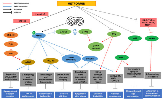 Mechanisms of action of metformin on cellular and molecular markers of aging (adapted from Kulkami et al. [33]). The red lines in the figure represent AMPK-independent mechanisms. The blue lines represent AMPK-dependent mechanisms. The inhibitory capacity of the molecular elements is given by the lines ending with a bar, while the arrows refer to the capacity for stimulatory action. Abbreviations: AGEs, advanced glycation end products; Akt, protein kinase B; AMPK, 5′adenosine monophosphate-activated protein kinase; ATM, ataxia-telangiectasia-mutated; CXCL-1, C-X-C motif chemokine ligand 1; CXCL-2—C-X-C motif chemokine ligand 2; DICER1, enzyme; DNA, deoxyribonucleic acid; DNMT, DNA methyltransferase; GPx7, glutathione peroxidase 7; HAT/HDAC, histone acetyltransferase/histone deacetylase; IL-6, interleukin 6; ILs, interleukins; IRS-1/2, insulin receptor substrate 1/2; MCP-1, monocyte chemoattractant protein-1; miRNAs, microRNAs; mRNAs, messenger RNAs; mTOR, mechanistic target of rapamycin; NF-kB, nuclear factor kappa B; Nrf2, nuclear-erythroid factor 2-related factor 2; p16, protein 16; p21, protein 21; PAI-1, plasminogen activator inhibitor-1; PGC-1α, peroxisome proliferator-activated receptor gamma-coupler-1 alpha; PI3K, phosphoinositide 3-kinase; ROS, reactive oxygen species; TERRA, telomeric repeat RNA; TNF-α, tumor necrosis factor alpha; VEGF, vascular endothelial growth factor.