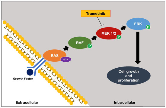 Trametinib action (adapted from Khunger et al. [46]). Arrows in black represent the stimulatory action of molecular elements. Abbreviations: ERK, extracellular signal-regulated kinase; GTP, guanosine triphosphate; MEK, mitogen-activated protein kinase; P, phosphorus; RAF, kinase; RAS, GTPase.