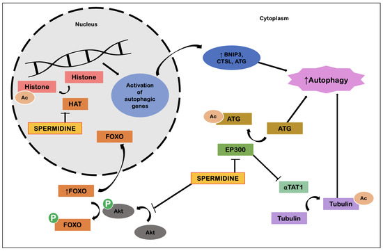 Spermidine-induced induction of autophagy (adapted from Madeo et al. [48]). Abbreviations: Ac, acetylation; Akt, protein kinase B; ATG, autophagy-related proteins; BNIP3, Bcl-2 interacting protein 3; CTSL, cathepsin L; EP300, E1A binding protein P300; FOXO, forkhead box O; HAT, histone acetyltransferase; P, phosphorus; αTAT1, alpha tubulin acetyltransferase 1.