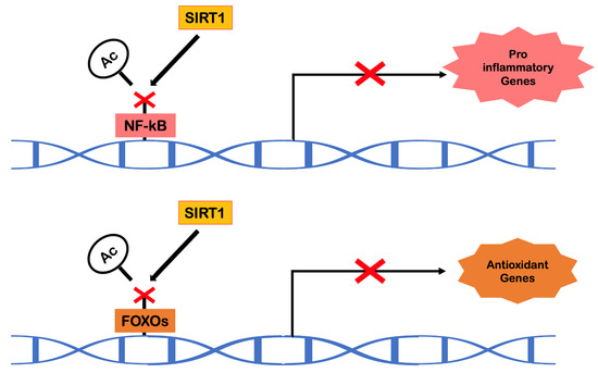 Transcriptional modulation of SIRT1 (adapted from Cheng et al. [64]). Abbreviations: Ac, acetylation; FOXO, forkhead box O; NF-kB, nuclear factor kappa B; SIRT1, sirtuin 1.