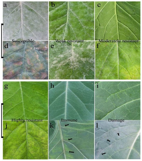 Compared to the modern rapeseed cultivar ‘ZS11’, Ethiopia mustard ‘WF’ and ‘BCWF’ (their F1 backcross to WF) had thinner leaves but a more compact foliar cell arrangement (Figure A1). The lower, older leaves of the susceptible plants were easily attacked by PM pathogen E. cruciferarum, but the undeveloped young leaves of all the tested plant accessions were never infected. The PM infection had obvious differences on the fully expanded leaves of different plant accessions after the inoculation (Figure 1). The susceptible cultivar ‘ZS11’ (Figure 1a) and the weakly resistant plant in the BC1F3 population (Figure 1b) showed more hyphae than the moderately resistant plant in the BC1F3 population (Figure 1c) and the highly resistant ‘BCWF’ (Figure 1g). Several weeks later, PM infection led to many necrotic lesions on the older leaves of these plants (Figure 1d–f,j). Hypha was seldom found on the leaves of ‘WF’ (Figure 1h) and only a few PM spores could form brown dots near the veins of the older leaf, especially on the abaxial epidermis (Figure 1k). It is believed that an existing aperture, such as a stoma or an injury on the host tissues, is able to be attacked by fungi [], but we found that artificial injury by sandpaper friction did not help E. cruciferarum spores penetrate more easily into the epidermal cells of the ‘WF’ (Figure 1i). Exceptionally, the vulnerable plants in ‘WF’ due to root damage showed a mild PM infection (Figure 1l), indicating a possible association of water/mineral element deficits or photosynthesis inhibition with PM infection.