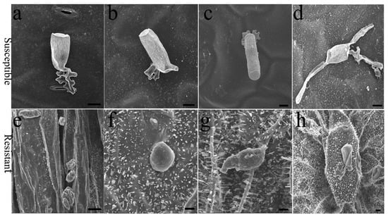 The E. cruciferarum spore has particular mechanisms for the attachment, identification and invasion of the host plant. When the spore alighted on the leaf, the early events of PM pathogenesis involved swelling and differentiating into a multi-lobed appressorium of the tip of the hyphal germ tube (Figure 2). On the susceptible plant, the events of appressorium formation and cell penetration could be found on the stomatal cells, pavement cells and furrows between adjacent cells (Figure 2a–c). Then, host cell penetration and the formation of haustorium enable the spore to absorb nutrients from the host plant. The second event in PM pathogenesis, the germination of secondary hyphae (Figure 2d), is a reliable indicator of successful cell penetration and haustorium differentiation, as a previous study suggested []. Compared to the ‘WF’ and ‘BCWF’, the susceptible ‘ZS11’ and the moderately resistant plants showed a very high fungal entry rate, with microscopically visible host cell penetration, the formation of secondary hyphae (Figure 2) as well as the establishment of PM colonies. Therefore, PM pathogenesis was not terminated early on the susceptible and moderately resistant accessions. On the highly resistant and immune plants, only very few spores could adhere to the abaxial surface due to drop into the furrows, but these spores died shortly without appressorium differentiation (Figure 2e–g). Occasionally, it was observed that on the abaxial epidermis of ‘WF’, some irregular nodules formed at the PM infection site (Figure 2h). To our knowledge, this unique morphological response to PM has not been reported in the previous literature. It would be interesting to dissect the wrinkled tissues, as well as cuticular wax, at the sites of spore attachment.