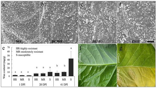 Comparison of the shape and content of the cuticular wax in different leaves and the effect of partially washing off the surface wax. The accessions in (a–d) are ‘WF’, ‘BCWF’, the moderately resistant plant in the BC1F3 population and ‘ZS11’, respectively. The cuticular wax of ‘BCWF’ and ‘WF’ is needle-like. The wax crystals of resistant plants in ‘WF and ‘BCWF’ are tubular-like or short and tubular, while that of ‘ZS11’ is mostly flake-like. The cuticular wax content in the leaves of plant accessions of different resistance levels (e). Different letters indicate significant differences (p < 0.05). Washing off surface wax from a half blade of ‘WF’ young leaf (f) leads to early senescence but not PM susceptibility (g).