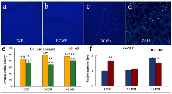 The upmost fully expanded leaf samples of S/R plants in the BC1F3 population at 1, 20 and 41 DPI were stained with a solution of 1% Aniline Blue and visualized under a fluorescence microscope. The average optical density of callose deposition was quantified in the software ImageJ (2 Mar 2020, v2.0.0, https://imagej.nih.gov/ij/).