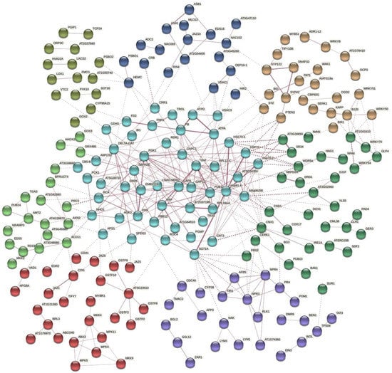 A network of protein–protein interactions based on Arabidopsis homologs of the DEGs. The image was produced on the STRING platform. The proteins are clustered and shown by their nodes in different colors. Thickness of edges indicates different confidence levels. Dotted lines are the edges between different clusters.
