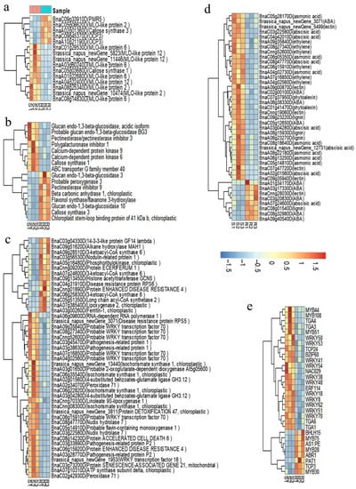 The DEGs related to disease resistance and stress responses were matched through the STRING database to obtain the protein–protein interaction network (Figure 5). Some important proteins clustered in the network including (1) LOX1-LOX2-PAE1-HSP70-PRC3, (2) COI1-JAZ1-JAZ5-JAZ6-JAZ10-TIFY7-TIFY10B-EIN3, (3) WRKY51-WRKY50-WRKY70-WRKY54, (4) BAK1-MEKK1-BIR1-bZIP60-TET8-EXO70B2-XBAT34-MPK11-NUDT7, (5) ATPD-TROL-EMB3119-CRB-PSBO1-PSBO2-GOX2-SBPASE-PRK and (6) RPS2-EMB2270-ATARCA-SAC52-EMB2386-PGY2-RPL27AB-RPL21A-RPL18AA-At1g52300. A heatmap (Figure 6) showed obvious differences in the expression levels of five subsets of interesting DEGs encoding proteins related to (a) S/R to PM, (b) cell wall structure, (c) disease resistance, (d) transcription factors and (e) plant hormone signaling among the S/R plants.