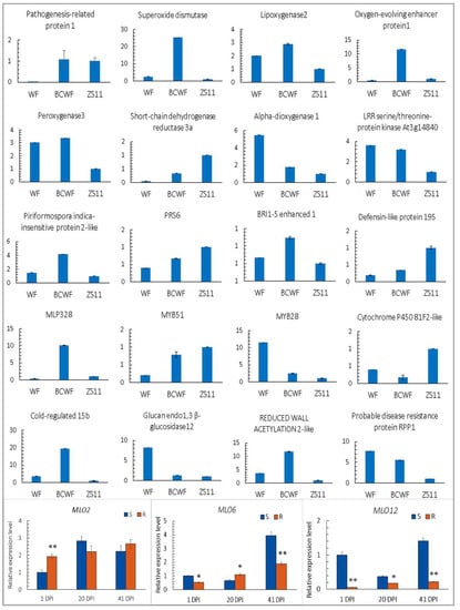 The expression levels of the 20 selected genes detected by qPCR in ‘WF’, ‘BCWF’ and ‘ZS11’ and BnMLO2, BnMLO6 and BnMLO12 in the S/R plants. Symbols above the bars indicate significant differences at p < 0.05 (*) and p < 0.01 (**).