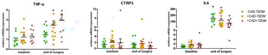 2.3. Relative mRNA Quantification of TNF-α, CTRP3, and IL6 in EAT and SAT
