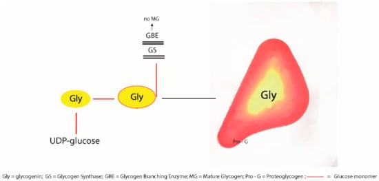 The discovery of glycogenin as the initiator of glycogenesis and its capacity for self-glycosylation [] and of proteoglycogen [] have contributed to understanding the maturation process of glycogen gamma particles into beta and alpha granules [], as well as the arrest of maturation and storage in the form of PB (Figure 1).