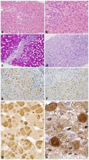 - Lefkowitch, J.H.; Lobritto, S.J.; Brown, R.S., Jr.; Emond, J.C.; Schilsky, M.L.; Rosenthal, L.A.; George, D.M.; Cairo, M.S. Ground-glass, polyglucosan-like hepatocellular inclusions: A “new” diagnostic entity. Gastroenterology 2006, 131, 713–718. [Google Scholar] [CrossRef] [PubMed]