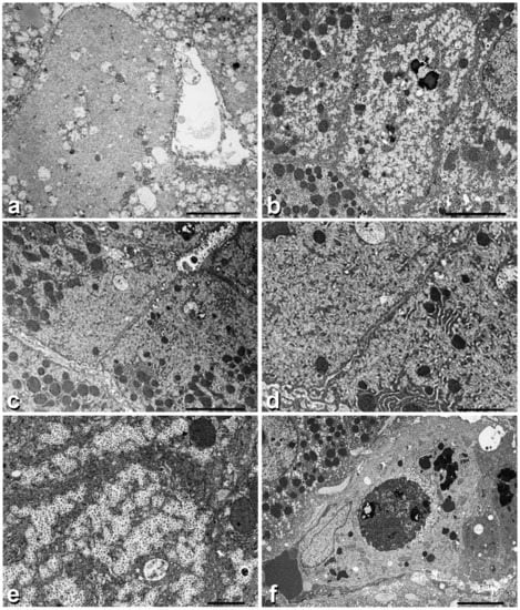 In biopsy n.2, the electron-lucent material was occupying half of the cell cytoplasm and displaced the organelles towards the remaining half (Figure 3b). This phenomenon was better appreciated in adjacent hepatocytes (Figure 3c). In the third biopsy, individual granules acquired a star-like contour, mimicking non-confluent alpha or beta granules (Figure 3d). Several hepatocytes showed signs of cytoplasmic damage: increase in the number and polymorphism of lysosomes (Figure 3b), mitochondriophagy (Figure 3c), autophagic vacuoles (Figure 3c,d) and megamitochondria (Figure 3e). Moreover, apoptotic bodies were seen in the sinusoids or within the cytoplasm of hypertrophic Kuppfer cells (Figure 3f). Apoptotic bodies contained compact aggregates of dense unstructured granules.