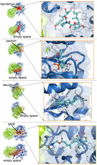 Docking poses of tacrolimus, bactrim, deursil, MMF on the structure of the homodimeric apo-glycogenin-1. For each drug, the whole protein–drug complex, the protein with the calculated empty spaces, a zoomed view of the bound drug (balls and sticks) and its interactions (dotted lines) with amino acids (thin sticks) are shown.
