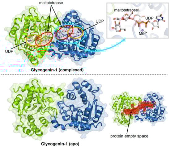 Crystal structures of the homodimeric human glycogenin-1 complexed with UDP and maltotetraose (PDB 3U2U; the binding regions of ligands are highlighted by ovals) and the apo protein (PDB 3Q4S; the interior empty space of the protein is indicated by red dots).