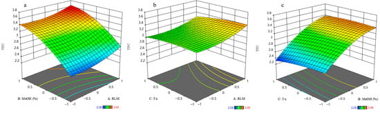 According to the multinomial Equation (1), the primary terms of the robust linear model (RLM) (X1) and methanol % (X2) had a positive effect on TPC retention. In particular, the variable methanol % exhibited a highly significant (p < 0.0001) influence on TPC yield. This fact suggests that most of the bioactive compounds in J. sabina needle extracts had low polarity. The response surface model of TPC in a function of the RLM (X1) and methanol % (X2) implied that both factors affected their recovery (Figure 1). It also indicated that intermediate values of RLM and high values of methanol % resulted in maximum recoveries (>546 mg GAE/g).