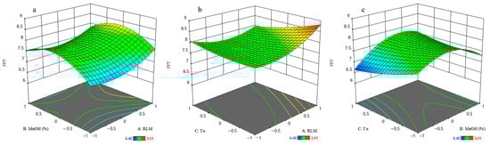 Considering the regression coefficients (Table 3), the quadratic terms of methanol % (X2) all significantly affected antioxidant activity (p < 0.01), having a negative effect on ABTS and FRAP capacity (Supplementary Material Figures S3 and S4). The variation pattern of Supplementary Material Figure S5a,c showed that the FRAP values of the extracts all started to decrease as the methanol % increased to about 80%. Piwowarska and González-Alvarez [] analyzed the antioxidant capacity of forestry biomass extracts on the dependence of solvent concentration and obtained similar results. In addition, both the liner and quadratic terms showed a positive effect on DPPH capacity (Equation (7)), and the DPPH values of the extracts increased with methanol % (Supplementary Material Figure S5a,c). Thoo et al. [] reported that the DPPH in Morinda citrifolia extracts increased with ethanol concentration.