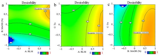 Desirability surface plot: (a) as a function of ratio of material to liquid (RLM) and percentage of methanol; (b) as a function of RLM and ultrasonic time; (c) as a function of percentage of methanol and ultra-sonic time.