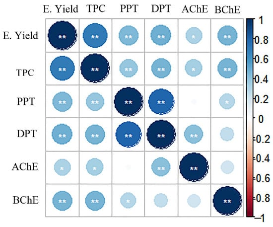 Relationship between bioactive compounds and biological activities in the needles of J. sabina. “*”: p < 0.05; “**”: 0.01 < p < 0.05; E. yield: the extraction yield; TPC: total phenol content; PPT: podophyllotoxin; DPT: deoxypodophyllotoxin; AChE/BChE: the anti-cholinesterase activity values of J. sabina extracts.