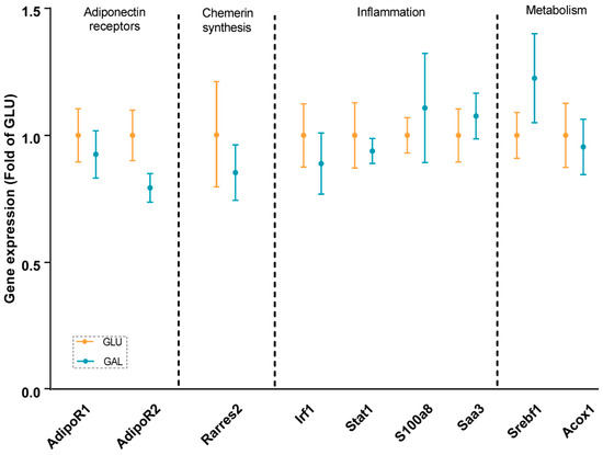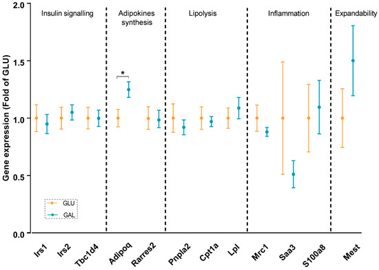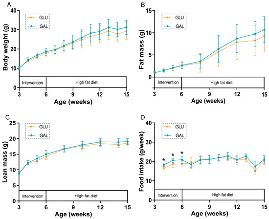 - Bouwman, L.M.; Fernández-Calleja, J.M.; van der Stelt, I.; Oosting, A.; Keijer, J.; van Schothorst, E.M. Replacing part of glucose with galactose in the postweaning diet protects female but not male mice from high-fat diet–induced adiposity in later life. J. Nutr. 2019, 149, 1140–1148. [Google Scholar] [CrossRef]