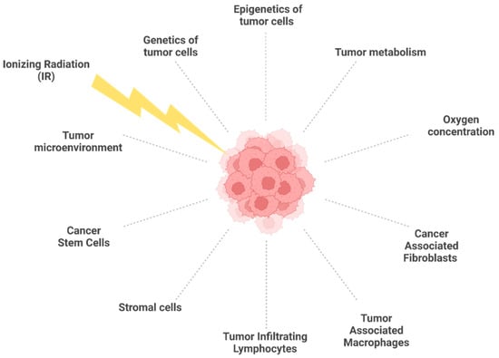 Biological factors affecting tumor radioresistance. In response to IR, the diverse components of the tumor microenvironment interact each other, with tumor cells contributing to radioresistance. Created with BioRender.