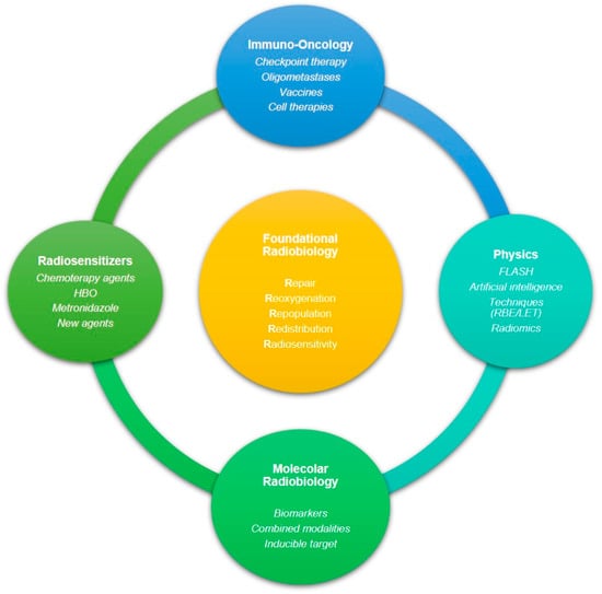 The multifaceted spectrum of radiation biology research, mechanisms, and clinical applications. In the center, the 5Rs explain the biological basis of radiobiology.