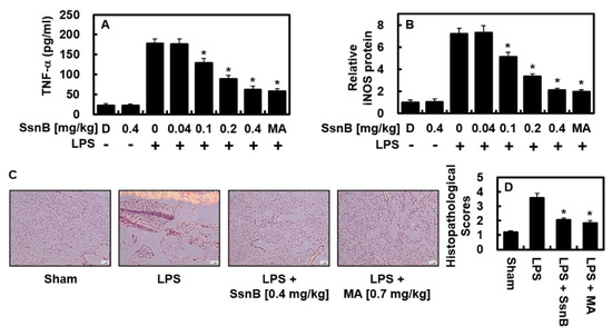 2.4. Suppressive Effect of SsnB on LPS-Mediated TNF-α and iNOS Protein Levels In Vivo