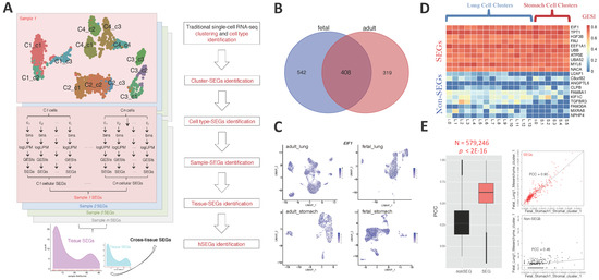 Identification of SEGs at single-cell level. (A) The pipeline for SEG identification. (B) 408 spatial-temporal SEGs were identified from both adult and fetal tissues. (C) Expression of a representative spatial-temporal SEG, EIF1, in single-cell clusters of representative samples. One sample was selected randomly for each of the adult lung, adult stomach, fetal lung and fetal stomach tissues, respectively [25]. The single cells were clustered according to the gene expression profile, and shown as points in a two-dimension plane of Uniform Manifold Approximation and Projection (UMAP) [26]. The gene expression level was represented by the color shown in the scale bar. (D) GESI heatmap of representative SEGs and non-SEGs in cell clusters of representative samples. Ten spatial-temporal SEGs and ten non-SEGs were randomly selected. Two scRNA-seq samples were selected from the adult tissues randomly [25]. (E) Expression correlation of SEGs and non-SEGs between samples. All 408 SEGs and paired 408 non-SEGs randomly selected from the non-SEG gene set were used for the analysis and comparison. The Pearson Correlation Coefficients (PCCs) were calculated for SEGs and non-SEGs between each inter-sample cell-cluster pair, respectively, and there were 579,246 pairs in total. A Mann-Whitney U test was performed between the PCCs of SEGs and non-SEGs. The correlation of SEGs and non-SEGs between a representative cell-cluster pair was also shown.