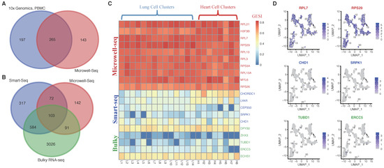 Comparison of SEGs identified from different datasets. (A) Comparison of the spatial-temporal SEGs (Microwell-Seq) and PBMC SEGs identified from 10x Genomics scRNA-Seq datasets. (B) Comparison of the Microwell-Seq SEG, Smart-Seq SEG [3] and bulky RNA-seq HKG lists [1]. (C) GESI heatmap of representative genes inconsistent among the Microwell-Seq SEG, Smart-Seq SEG and bulky RNA-seq HKG lists. Ten Microwell-Seq SEGs, five Smart-Seq SEGs and five bulky RNA-seq HKGs not covered by the other two gene lists (from the specific subsets shown in Figure 2B) were selected randomly, and their cellcluster GESIs in two representative samples were shown. The samples were randomly selected from [25], both of which were from adult tissues. (D) Expression of two representative SEGs/HKGs specifically detected by Microwell-Seq (RPL7 and RPS29), Smart-Seq (CHD1 and SRPK1) or bulky RNA-seq (TUBD1 and ERCC5) in single-cell clusters of a representative sample. The representative sample (an adult lung sample) was selected from [25] randomly.