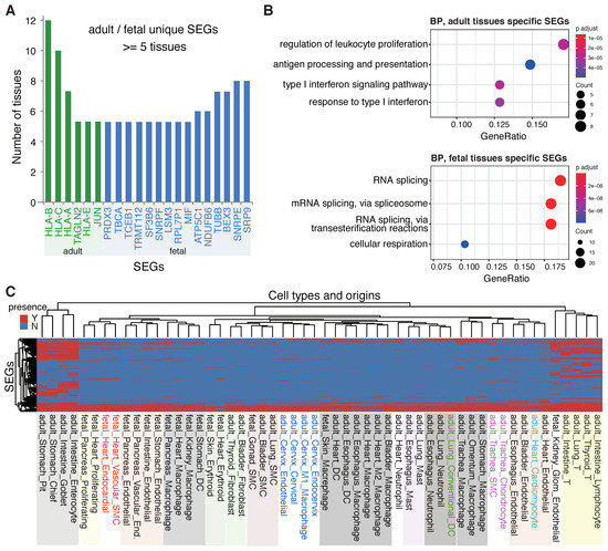 A large variety of SEGs were identified from different tissues, the clustering of which by their presence patterns did not show apparent regularity for the tissues, except for some atypical grouping-together trend for the tissues from the same developmental stages, i.e., adult and fetal stages (Supplemental Figure S4). Unique SEGs were therefore retrieved for different developmental stages. It was interesting to find that the most reliable adult-stage specific SEGs, which were common in no fewer than five adult tissues but not present in any fetal tissue, were mainly immune-related genes, e.g., HLA-A, HLA-B, HLA-C and HLA-E (Figure 3A). The four HLA genes are all HKGs identified elsewhere (https://housekeeping.unicamp.br/?visualization (accessed on 12 July 2022)). They were not expressed stably in fetal tissues, potentially suggesting the immatureness of acquired immune systems. It is unclear about the role of JUN that was stably expressed in adult but not in fetal tissues. For the fetal stage, spliceosome related genes, such as SNRPE, SNRPF and SF3B6, were apparently enriched in its unique SEGs (Figure 3A). The criteria to identify the development-stage specific SEGs, that is, being common in no fewer than two tissues from one stage and not present in any tissue from the other stage, functional analysis was performed to the stage-specific SEGs, and consistently, the SEGs unique to adult tissues were enriched in immune processes while the SEGs unique to fetal tissues were enriched in RNA splicing significantly (Figure 3B).