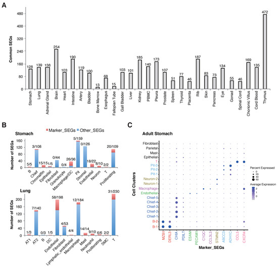 Tissue SEGs and within-tissue cell-specific SEGs. (A) Tissue SEGs. The SEGs were common for each cell type within the corresponding tissue. (B) Within-tissue cell-specific SEGs and marker SEGs in representative tissues. For each tissue, the composition cell types, the number of cell-specific SEGs, and the number of cell-specific marker SEGs were shown. For the numbers presented as ‘x/y’ on the top of each bar, ‘x’ and ‘y’ represented the number of cell-specific SEGs and marker SEGs, respectively. Marker SEGs represent SEGs that are expressed specifically or with striking higher level in indicated cell types and can be used as gene markers for the corresponding cells. (C) Expression of representative cell-specific marker SEGs in cell clusters of a representative sample. The representative stomach sample was selected from [25] randomly.