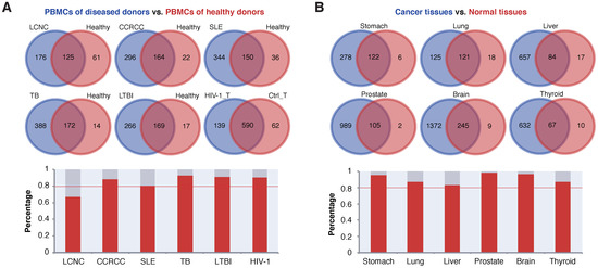 SEGs were identified from the PBMCs of patients with various tumors, systemic lupus erythematosus (SLE), active tuberculosis (TB) and latent tuberculosis infection (LTBI), and compared with the SEGs analyzed from healthy human PBMC samples, respectively. Except for large cell neuroendocrine carcinoma (LCNC, 67.2%), more than 80% of the SEGs from healthy PBMCs were repeatedly covered by those identified from the PBMCs of patients with all the other diseases (Figure 5A). For TB and LTBI, the SEG coverage was larger than 90% (Figure 5A). SEGs were also identified from T cells of PBMC samples infected with HIV-1 and non-infected controls. Similarly, a high proportion (>90%) of the control SEGs was covered by those identified from HIV-1 infected samples (Figure 5A).