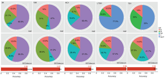 Performance of the SEGdecon model. SEGdcon was used to predict the proportion of major immune cells in PBMC samples. Each testing dataset was shown in a column. The real and predicted composition percentages of each major immune cell type were shown in the pie charts. The average accuracy was shown at the bottom for each testing dataset.