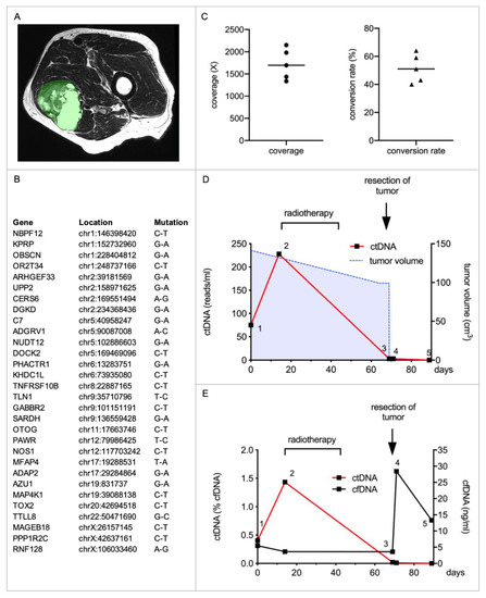 ctDNA enables monitoring of the treatment response of neoadjuvant radiotherapy and tumor resection in a patient with myxofibrosarcoma. (A) The patient presented with a primary tumor (tumor volume: 141.2 cm3) of his left thigh. Shown is a representative section of the MRI imaging with the tumor highlighted in green. After interdisciplinary case discussion, neoadjuvant radiotherapy was initiated before the tumor was surgically removed. (B) An individual mini-panel covering 30 mutations identified by exome sequencing was established for targeted NGS. Genomic coordinates are based on GRCh37 (hg19). (C) Five plasma samples were collected during his treatment, cfDNA was isolated, and ctDNA was therein quantified. Depicted are the coverage (circles) and conversion rates (triangles) of each sample after building UMI consensus families. Means are illustrated by horizontal bars. (D) Absolute quantification of ctDNA during the course of his treatment. Sample 1 and 2 were obtained before initiation of radiotherapy, sample 3 before surgery, and sample 4 and 5 after tumor removal. Depicted are absolute amounts of ctDNA (red line). The tumor volume, as calculated from MRI imaging, is depicted by the blue dashed line. (E) Depicted are the cfDNA concentrations (black line) and relative amounts of ctDNA (red line) in the same five plasma samples.