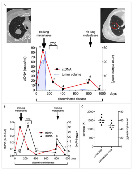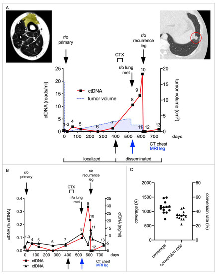 ctDNA enables the detection of local and distant metastases in a patient with leiomyosarcoma. (A) The patient presented with a primary tumor (yellow, volume: 15.8 cm3) on her shin which infiltrated the tibia as demonstrated in the MRI image (left). After neoadjuvant radiotherapy, the tumor was resected. Routine follow-up according to ESMO guidelines was conducted. In the second year after removal of the primary tumor, lung metastases and a local recurrence were detected. As there was progressive disease with chemotherapy (CTX), several lung metastases and the recurrence were resected. An individual mini-panel covering seven mutations identified by exome sequencing was established to quantify ctDNA in 13 plasma samples. Absolute quantification revealed low levels of ctDNA during follow-up, indicating MRD (sample 4–7). Levels rose steadily during progressive disease (sample 8–10) and again decreased after tumor resections (sample 11 and 12). Depicted are absolute amounts of ctDNA (red line). The tumor volume, as calculated from MRI and CT imaging, is depicted by the blue dashed line. Colored arrows indicate the timepoints of CT chest and MRI imaging, at which the recurrence/metastases were first detected. The red circle in the right subfigure demonstrates the representative metastasis in CT chest. (B) Depicted are the cfDNA concentrations (black line) and relative amounts of ctDNA (red line) in the same samples. (C) shows the coverage (circles) and conversion rate (triangles) of each sample after building UMI consensus families. Means are illustrated by horizontal bars.