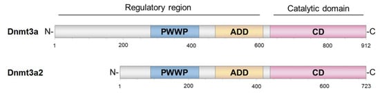 Domain architecture of full-length MTase Dnmt3a and its isoform Dnmt3a2. ADD indicates ATRX-DNMT3-DNMT3L domain; PWWP is Pro-Trp-Trp-Pro domain.