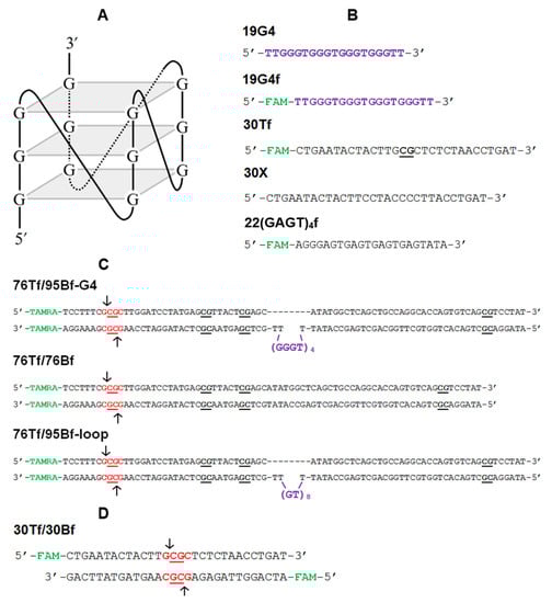 Synthetic DNA models included: (i) oligonucleotides 19G4 and 19G4f, capable of folding into a parallel G4 structure (Figure 2A,B), as well as control randomized oligonucleotides 30Tf and 30X, which differ in the presence of a CpG site, and 22(GAGT)4f oligonucleotide containing four G > A substitutions compared to 19G4f, which prevent the G4 formation (Figure 2B); (ii) a DNA duplex containing a G4-forming insert (76Tf/95Bf-G4), as well as a control perfect duplex 76Tf/76B and a double-stranded DNA containing a looped out d(GT)8 sequence (76Tf/95Bf-loop) (Figure 2C); (iii) DNA duplex 30Tf/30Bf used as a known MTase substrate (Figure 2D). In the designation of DNA models, the following points are indicated: the oligonucleotide length, the strand location—conditionally top or bottom (T or B, respectively), the presence of a fluorescent label (f), 5-carboxytetramethylrhodamine (TAMRA) or 6-carboxyfluorescein (FAM), and the embedded G4 motif (G4) or unstructured d(GT)8 repeat (loop). In our DNA models, the biologically relevant d(GGGT)4 sequence, known for its wide distribution in eukaryotic genomes and strong ability to form a stable G4 with a parallel topology inherent in promoter G4s, was applied. As DNA duplexes containing G4 or GT repeats, we used the original DNA constructs proposed in our previous paper [28], in which the G4 or loop structures were stabilized in a double-stranded context. To prevent the formation of a competing Watson–Crick double helix, these DNA models were prepared by hybridization of partly complementary strands, one of which contained the G4 motif or d(GT)8 repeat flanked by oligonucleotide fragments, while the opposite strand lacked a site complementary to oligonucleotide inserts; the sequence of the DNA duplex flanks was chosen arbitrarily.
