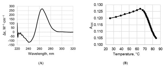 We applied a combination of circular dichroism (CD) and ultraviolet (UV) spectroscopy to study the secondary structure and thermal stability of the DNA quadruplex formed by 19G4. CD spectra of 19G4 were examined in buffer A containing 100 mM KCl; this K+ concentration close to that in human cells (~150 mM KCl) was used in our G4-protein binding experiments and MTase-mediated methylation analysis. The CD spectrum of 19G4 recorded at room temperature revealed a typical parallel G4 fold with a positive peak at 265 nm and a negative one around 240 nm (Figure 3A) [30]. Using CD data recorded at different temperatures, we obtained the 19G4 melting curve (Supplementary Figure S1, inset), but due to the high thermal stability of quadruplex structure in the presence of 100 mM KCl, an accurate assessment of the 19G4 melting temperature (Tm) was not possible. For this reason, the temperature dependence of UV absorbance at 295 nm, which is a marker of a G4 structure, was measured in buffer B containing 2.5 mM KCl; a reduced KCl concentration was chosen to capture the entire G4-coil conformation transition within the available temperature range (Figure 3B). The hypochromic effect and a sigmoidal shape of the melting profile indicate the G4 unfolding with a Tm of 76 ± 1 °C. Spectroscopic data confirm that the d(GGGT)4 sequence, flanked by d(TT) dinucleotides, folds into an extremely stable parallel G4 even under potassium-depleted conditions.
