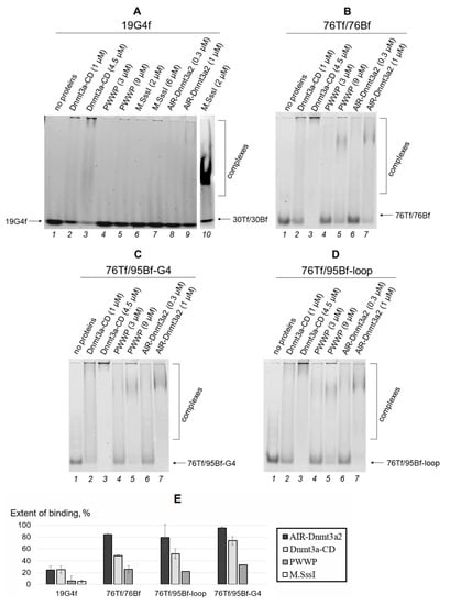 We then characterized the binding affinity of AIR-Dnmt3a2 and its domains to the G4 structure stabilized in the duplex surrounding (76Tf/95Bf-G4) (Figure 4C,E) compared to a similar model with a non-structured d(GT)8 loop (76Tf/95Bf-loop) (Figure 4D,E) and the perfect DNA duplex 76Tf/76Bf (Figure 4B,E). It was revealed that 1 μM AIR-Dnmt3a2 almost quantitatively binds 76Tf/95Bf-G4. However, the binding efficiency of Dnmt3a-CD (1 μM) decreases to ~70%, while for the PWWP domain (3 μM) it reaches only ~30% (Figure 4C,E). A similar pattern of changes in the binding extent was observed for the loop-containing DNA duplex (76Tf/95Bf-loop) and the perfect duplex 76Tf/76Bf (Figure 4E). PWWP could effectively bind DNA duplexes only at a protein concentration of 9 µM (Figure 4B–D). The G4-containing substrate 76Tf/95Bf-G4 showed a significant advantage in binding to Dnmt3a-CD compared to the 76Tf/95Bf-loop and 76Tf/76Bf (Figure 4E). The last two DNA duplexes bound Dnmt3a-CD with equal efficiency. We found no difference in the binding of the studied DNA duplexes to AIR-Dnmt3a2 or PWWP.