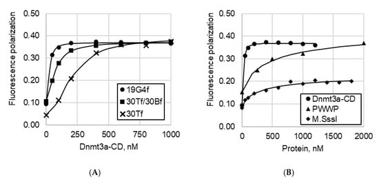 The binding of Dnmt3a domains to 19G4f, 30Tf, or 30Tf/30Bf was investigated by a fluorescence polarization assay via direct titration of FAM-labeled DNA duplexes with MTase domains in the presence of AdoHcy (100 µM) as described before [40]. Various amounts of a protein under investigation were added to a mixture containing 10 nM DNA in buffer A, and fluorescence polarization (P) was measured using a Cary Eclipse spectrofluorometer (Varian, Palo Alto, CA, USA) with excitation at 495 nm and emission at 520 nm at 25 °C in 120 µL cuvettes with a 1 cm pathlength. P was calculated according to the equation P = (Iv − G·Ih)/(Iv + Ih), where Iv and Ih are vertical and horizontal components of the emitted light, respectively, and G is a correction factor that was measured once before each experiment. The experimental data are presented as a dependence of P on the total protein concentration. The titration curves of each DNA duplex with the MTase were obtained in at least two technical replicates. Dissociation constants (Kd) of the complexes were obtained by the fitting of the observed P dependences on the protein concentration to a logistic equation using the OriginPro 8.0 software (OriginLab, Northampton, MA, USA):