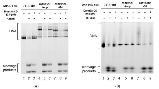 In the first series of experiments, the methylation activity of Dnmt3a-CD toward 76Tf/76Bf, 76Tf/95Bf-loop, and 76Tf/95Bf-G4 was examined. In our previously developed assay, DNA duplexes were methylated with Dnmt3a-CD at various concentrations and then digested with the R.Hin6I endonuclease, which cleaves unmethylated R.Hin6I recognition site [29], overlapping with one of the CpG sites located in the duplex flanks. The reaction mixtures were resolved by polyacrylamide gel electrophoresis under denaturing conditions (Figure 7), and the extent of methylation was calculated from the ratio of the combined fluorescence intensity of 8- and 10-nt cleavage products to the total DNA fluorescence intensity (Table 2).