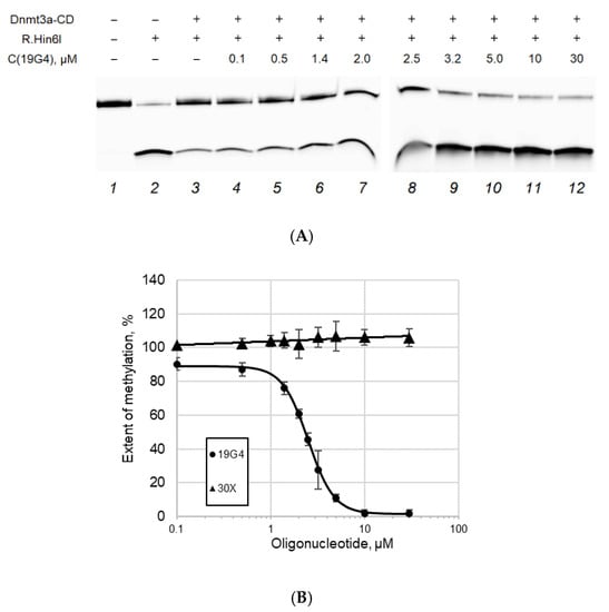In the second series of the experiments, we assessed whether the G4 structures could inhibit the activity of Dnmt3a-CD toward 30Tf/30Bf as a cognate substrate. The extent of methylation was calculated as described above. In the absence of 19G4, the 30Tf/30Bf duplex is almost completely methylated (Figure 8). As the concentration of 19G4 in the mixture was raised, the extent of methylation of 30Tf/30Bf decreased, implying the inhibition of Dnmt3a-CD. The dependence of methylation extent on the 19G4 concentration (Figure 8B) was used to calculate the IC50: 2.5 ± 0.1 μM. On the contrary, even in the presence of a large excess of an oligonucleotide lacking G4 (30X), no inhibition of MTase activity was observed.